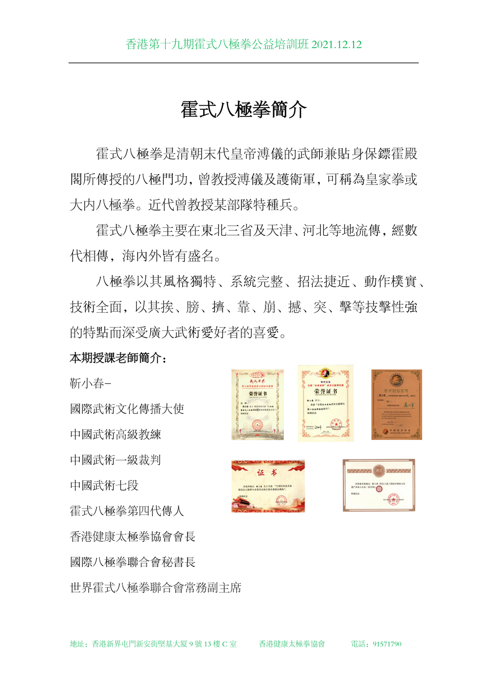 第十九期霍式八极拳公益培训班12月12日在港举办